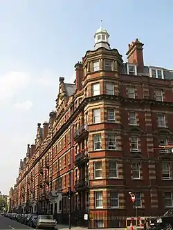 Clarence Gate Gardens is a fine example of the Edwardian mansion blocks built in London at the beginning of the twentieth century. The seven storey, red brick apartments with stone dressings show a number of Arts and Crafts and Art Nouveau influences. Large and elaborate Dutch gables contain two additional roof storeys, with paired bay windows rising the full height of the buildings, joined by sinuous Art Nouveau railings. The blocks have segmental porch hoods supported on pairs of ionic columns. The inner doors have fine Art Nouveau handles.[3] On the Glentworth Street elevations, they feature wrought iron Art Nouveau balconies.