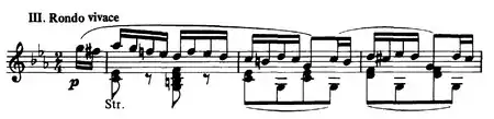 3. Rondo (Vivace) (in C minor and in sonata rondo form) – The overall form is "First Subject in C minor – Secondary Subject in E major – First Subject in C minor – Development in A major – Secondary Subject in C major – First Subject in C minor – Coda in C minor". Unlike many classical works, the finale fades away in C minor, instead of ending with loud chords.