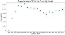 Clarke County is a county located in the U.S. state of Iowa. As of the 2020 census, the population was 9,748.[1] The county seat is Osceola.[2] The county was formed in January 1846, one of twelve counties established by legislative action in a comprehensive act.[3][4] It was named for James Clarke, a Governor of the Iowa Territory.[5]