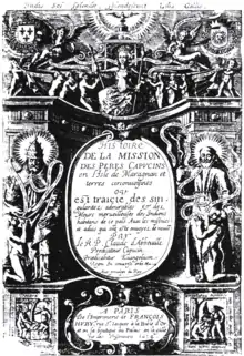 The mission organized the dispatch of Tupinambá Indians from Maragnan to the court of Louis XIII in France, where they created a sensation.[3] Père Claude d'Abbeville commented enthusiastically on the visit of the Indians in Paris with the words: "Who would have thought that Paris, used to the strange and the exotic, would go so wild over these Indians?".[3] The Indians – only three out of a total six had survived the travel by that time – were baptized in the Church of the Capuchins.[3][4]
