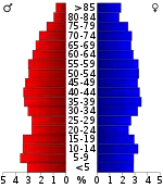 In the county, the population was spread out, with 23.1% under the age of 18, 7.7% from 18 to 24, 25.3% from 25 to 44, 24.6% from 45 to 64, and 19.4% who were 65 years of age or older. The median age was 40 years. For every 100 females there were 93.5 males. For every 100 females age 18 and over, there were 88.3 males.