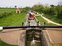 Construction of the Oxford Canal began north of Coventry in 1769. In May 1776 it reached Fenny Compton in Warwickshire, 2+1⁄2 miles (4 km) northwest of Claydon.[16] and by November 1777 the canal had been extended to Cropredy in Oxfordshire,[17] passing through Claydon parish by skirting the north and east sides of the hill on which Claydon stands. On the east side of the hill the canal's engineer Samuel Simcock built Claydon Locks, a flight of five locks that begins the canal's southward descent from its 11-mile long summit pound. Between them the five locks achieve a total rise (i.e. change in water level) of 30 feet 6 inches (9.3 m).[18]