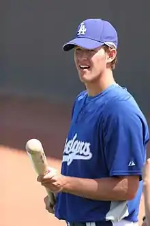 During spring training in a game against the Boston Red Sox, Kershaw gained much attention for throwing a curveball to Sean Casey that started behind Casey but at the end looped into the strike zone and struck him out looking.[30] Kershaw was 0–3 and had a 2.28 ERA with 47 strikeouts through 43+13 innings pitched in his first stint of the year with the Suns.[31] He was then called up to the majors on May 24, 2008, but optioned back to Jacksonville on July 2.[32]