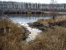 In its upper reaches, the Clearwater River flows over the Precambrian rocks of the Canadian Shield. That section of the river is rough, characterized by rapids, small waterfalls, and a gorge. The river leaves the Shield near the Alberta border and enters the Interior Plains where it becomes meandering, with numerous sand bars and small islands.[5] There it is flanked by outcrops of the Devonian limestones, dolomite, and shales of the La Loche, Contact Rapids, Keg River, and Waterways Formations, as well as the Cretaceous oil sands of the McMurray Formation.[6][7]