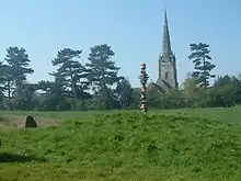 The parish church, dedicated to St Andrew, is a Grade I listed building.[21] Though nothing remains of the building mentioned in Domesday, some parts of the south wall date back to the year 1200, with traces of 13th century wall paintings. The church was enlarged into the shape of a cross in the first half of the 13th century. It was enlarged again in the 14th century. The tower was built in the first half of the 14th century, with a spire, reaching to a height of about 210 feet (65 m), added at some time during the century. The interior includes 14th century screens carved from oak; the rood screen is from the 15th century, as is some stained glass in one of the north windows. The church was restored by George Edmund Street in the second half of the 19th century, and again by W. D. Caroe in the early 20th century. In 1984 the spire was struck by lightning, with much damage to the church. Repairs were completed in 1987.[6][22]