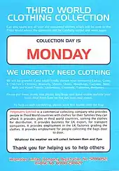 Clothing scam companies are companies or gangs that purport to be collecting second-hand clothes for charities or to be working for charitable causes, when they are in fact working for themselves, selling the clothes overseas and giving little if anything to charitable causes.[1] They are a particular problem in the United Kingdom, where they rely on people's awareness of proper charities established practise of collecting used clothes for good causes. These companies cause major problems for established charities in terms of lost donations and making the public distrustful of all clothes collectors.
