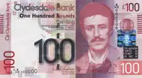 The Clydesdale Bank £100 note is a sterling banknote. It is the largest denomination of banknote issued by the Clydesdale Bank. The current cotton note, first issued in 2009 bears a portrait of the designer and artist Charles Rennie Mackintosh on the obverse and images of the Heart of Neolithic Orkney on the reverse.