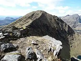 To the southwest of Cnoc na Péiste is the peak of Maolán Buí (973 m or 3,192 ft) and a generally flat grassy ridge to the col at the Devil's Ladder.[7] To the northeast is the narrow sharp rocky arête that joins with The Big Gun (939 m or 3,081 ft), and Cruach Mhór (932 m or 3,058 ft), which marks the end of the eastern ridge of the Reeks.[7]