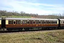 The livery of early carriages was a dark chocolate brown but from 1864 the upper panels were painted white which became a pale cream after being varnished and exposed to the weather. These panels were later painted in cream to give a similar effect. From 1908 carriages were painted chocolate brown all over but this changed to a red lake colour in 1912. A two-colour livery reappeared in 1922, now with a richer shade of cream on the upper panels and chocolate brown below. Certain vehicles such as parcels vans and horse boxes, which were allowed to run in passenger trains, were often painted in just chocolate brown when the passenger carrying coaches were in chocolate and cream, and so this non-passenger carrying coaching stock came to be known as "brown vehicles".[3]