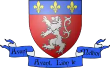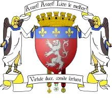 • The War Cry: The cry is represented traditionally on a ribbon above the shield: "Il servait autrefois de signal, soit pour livrer le combat ou se reconnaître dans la mêlée, soit pour rallier les troupes et ranimer leur courage" (It serves otherwise as a signal, either to begin combat or for soldiers to be recognized in the melée, or to rally the troops and restore their courage.)[9] For example, Montjoie-Saint-Denis would be the war cry of the kings of France, as Notre Dame Guesclin would be that of the constable Bertrand Du Guesclin. The war cry of the city of Lyons in the francoprovençal dialect which is documented from 1723 is "Avant, Avant, Lion le melhor!" This exhortation is, however, regularly confused with the motto and is frequently associated with the arms of the city in the representations on the ribbon under the shield.