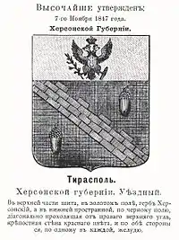 In 1868, a draft of the new coat of arms of Tiraspol was created. It was composed by a scarlet wall in the form of a scalloped baldric with silver seams, accompanied in the corners by two green acorns, in a silver shield. In the upper-right corner of the shield is the coat of arms of the Kherson Governate.[3]