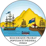 1889–1958 The badge of the crown-colony depicts the harbour of Port of Spain and mount El Tucuche with two Royal Navy frigate flying the white ensign and a boat with crew in the foreground. In base is the motto MISCERIQUE PROBAT POPULOS ET FOEDERA JUNGI, chosen by Sir Ralph Abercromby who captured Trinidad from the Spanish in 1797. The motto is quote from Virgil's Aeneid (Book IV, Line 112): ‘Miscerive probet populos, aut foedera iungi ’(He approved of the mingling of peoples and their being joined together by treaties).