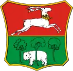 The Lublin Voivodeship of the Congress Poland was established on 16 January 1816.[5] Its coat of arms was divided horizontally into two fields. The top field depicted a white (silver) male jumping cervus (deer), with a yellow (golden) crown on its neck, placed on a red background. The bottom field depicted a white (silver) bear and a tree trees growing on a green grass, placed on a green background. The bear stood behind the middle tree. The coat of arms was a combination of the historical coat of arms of the Lublin Voivodeship of the Polish–Lithuanian Commonwealth, and the Chełm Land.[6] The voivodeship existed until 23 lutego 1837, when it was replaced by the Lublin Governorate, which continued using said coat of arms.[6][7]