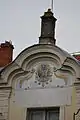 The emblem features an ornate cartouche ensigned by a tughra. The cartouche is surrounded by various elements of the state, including two flags: the red star and crescent flag of the Anatolian and Asian eyalets,[1] and the green flag of the Rumelia Eyalet,[1] largely obscured by a cornucopia. The North African provinces are not represented. Behind the flags are a number of spears and other weapons.