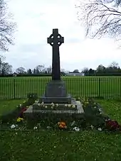 The Cockfosters War Memorial is located at the junction of Chalk Lane and Cockfosters Road in Cockfosters, London. It commemorates the men of the district who died in the first and second World Wars and is in the form of a tapered column with a celtic cross at the top and the names of the dead on the base. It was unveiled by the Bishop of Willesden in March 1921.[1]