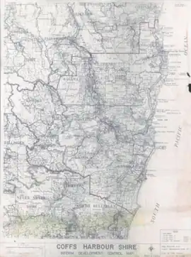The council seat of Coffs Harbour Shire was located on Vernon Street, Coffs Harbour.[2] Other towns within the shire include Sawtell, Mullaway, Kororo, Moonee Beach and Woolgoolga.[3]