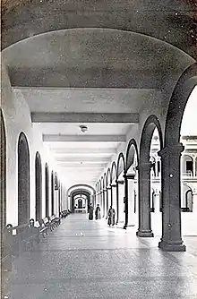 In mid-1923 the construction of this property was started, carried out by the company of architects and engineers Morales y Compañía Arquitectos, being built nine radiating pavilions, a central chapel of three floors, an entrance pavilion that had a fourth level where it was located the observatory. Its inaugural activities were carried out on December 19, 20 and 21, 1925, beginning its first course in January 1926.[4] The result was a monumental pan-optical edifice with an extensive neoclassical façade perpendicular to the large chapel and four large courtyards, recalling the building housing the convent in Havana Vieja, with three stories of porticoed galleries to link nine radial pavilions, the appearance is of instrumentality which is supported both in the design resources and the unusual dimensions of the spaces. The structure is built from the concrete-covered steel structure, the flooring, covered with tiles, and the roof are monolithic reinforced concrete slabs.