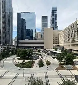 College Park (the park rather than the building) is a 0.75 hectares (1.9 acres) greenspace located behind the buildings in the block bordered by Yonge, College, Bay and Gerrard streets. It is the second largest park in downtown Toronto after Allan Gardens. It was built in the 1980s over an underground garage. The park was closed for renovations in early 2016 and reopened in 2019. Today, the park contains the Barbara Ann Scott Ice Trail.[5][6][7]