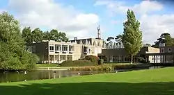Baron James of Rusholme, the university's first Vice-Chancellor, set out to create a modern university which retained and updated the collegiate system of the traditional collegiate universities of Oxbridge,[3] It was planned that "Each college will be a unit of 300 students, 150 of whom will be resident, the remainder being in lodgings or in student flats, but using the college as their social centre. This organisation is unlike that of Oxford and Cambridge on one hand or the halls of residence at civic universities on the other. The college will differ from 'Oxbridge' in that they will not be autonomous financially, nor will they be responsible for admission of students or appointment of staff. They will differ from halls of residence in that teaching will be carried on in them."[4] York's first two Colleges, Derwent and Langwith were founded in 1965, and were followed by Alcuin and Vanbrugh in 1967.[5] Goodricke and Wentworth were founded shortly afterwards, in 1968 and 1972 respectively.