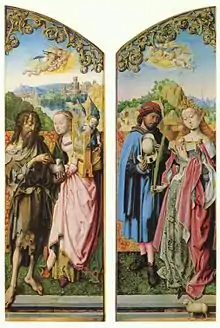 Initially smaller altarpieces such as the Klaren Altar in the Cologne Cathedral from about 1360–70 were created, based on book paintings from around the year 1300.[3] The mid-15th century is the high-point of this school, when Stefan Lochner (active 1442–1451) created the Altar of the City Patrons, which is considered to be the greatest masterpiece of the Cologne School.[4] A third creative period followed, under the influence of Netherlandish painters such as Rogier van der Weyden.[5] Rogier's influence is especially notable in the work of the outstanding representative of this final phase, the anonymous painter known as the Master of the Saint Bartholomew Altarpiece. For example, the latter's large Deposition of Christ resembles the same theme represented in the former's Escorial altarpiece, and the Master's heightened naturalism and emphasis on tear-stained features reflect Rogier's emotionalism.[6]