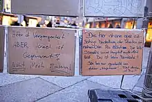 Messages denouncing the living conditions of Palestinian people were written on small cardboard pieces and suspended on clotheslines. The "Wailing Wall" was erected in 1991 in front of the south tower of the Cologne Cathedral, supported by a vigil against the Second Gulf War. The authorities attempted to stop the project multiple times, using lawsuits,[4] confiscations and evictions.