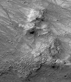 The Columbia Hills are a range of low hills inside Gusev crater on Mars. They were observed by the Mars Exploration Rover Spirit when it landed within the crater in 2004. They were promptly given an unofficial name by NASA since they were the most striking nearby feature on the surface. The hills lie approximately 3 kilometres (1.9 mi) away from the rover's original landing position. The range is named to memorialize the Space Shuttle Columbia disaster. On February 2, 2004, the individual peaks of the Columbia Hills were named after the seven astronauts who died in the disaster. Spirit spent a few years exploring the Columbia Hills until it ceased to function in 2010. It was also considered a potential landing site for the Mars 2020 Perseverance rover,[1] before the selection of Jezero crater in November 2018.[2]