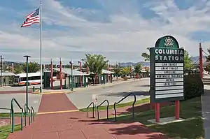 Columbia Station spans two city blocks in downtown Wenatchee, bound to the west by Wenatchee Avenue and to the north by Kittitas Street. The bus platforms are located on the west half of the complex, consisting of 16 bays arranged around a loop and central island, including an electric bus charger. The three-story station building is located in the northeast corner of the block and includes the Link Transit guest services center, a passenger waiting room, offices, public restrooms, and a cafe. A set of separate bus bays are located on Columbia Street and are used by intercity buses.[2][3] The 400-foot-long (120 m) train platform is located across Columbia Street from the rest of the complex, adjacent to a park and ride lot with 67 stalls.[4][5] Link Transit owns the building, bus bays, and parking lot, while BNSF Railway owns the train platform and other facilities.[3][6] The Apple Capital Recreation Loop Trail runs a block to the east of the train platform on the banks of the Columbia River.[7]