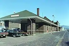 The new depot was substantially completed in October 1909, along with an underpass for Kittitas Street, a new roundhouse, and freight facilities at the old depot.[20] The Great Northern depot cost $100,000 to construct and was opened on February 11, 1910, on the same day as Wenatchee's new commercial club and high school. All three dedications were attended by officials from the city, Great Northern, as well as Governor Marion E. Hay. The station building measured 156 feet (48 m) long and 33 feet (10 m) wide with a 500-foot (150 m) covered platform. The interior had two waiting rooms with oak furniture, electric lighting, and a dining area.[21]