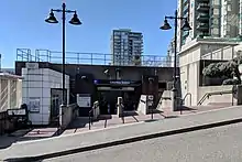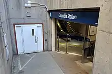 : connects the west side of the station with Columbia Street, half a level above, through a small shopping mall. An elevator is provided by the mall for station access. However, since this elevator is not a property of TransLink, the reliability of this accessible entrance is not guaranteed and it had been reported that the elevator can be out of service for an extended amount of time.[7] An up escalator is provided between the lower street level and the inbound platform only. Passengers accessing the outbound platform must climb up a full flight of 36 stairs.[7]