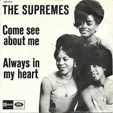 "Come See About Me" was written and produced by Motown's main production team Holland–Dozier–Holland.[4] It was recorded during a two week period in which the Supremes also recorded "Baby Love" after "Where Did Our Love Go" became their most successful single to date.[4] It was the #1 song on the Billboard Hot 100 singles chart for two separate weeks: December 13, 1964, to December 18, 1964, and January 10, 1965, to January 16, 1965, and reached the #3 position on the soul chart.[4] Billboard said that the song has a "pronounced Detroit beat, steady and exacting" and that the "Gals weave silky and controlled vocal through beat."[5] Cash Box described it as "a pulsating stomp-a-rhythmic...that the gals carve out in ultra-commercial manner" and in which the group was "in top-of-the-chart form."[6]