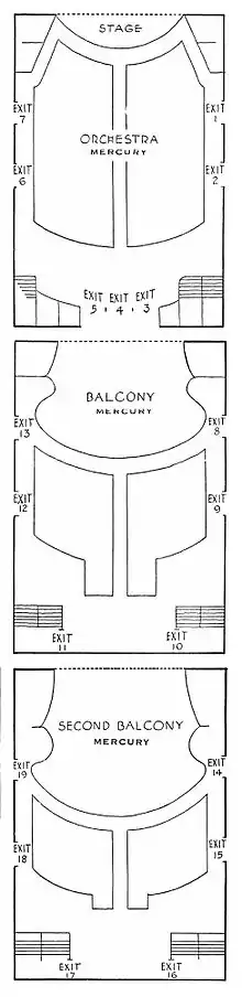 The Comedy Theatre was shuttered in 1931, in the aftermath of the Wall Street Crash of 1929.[1] It reopened in 1937 as the Mercury Theatre, leased by John Houseman and Orson Welles for their new repertory theatre company, the Mercury Theatre. Houseman later described the venue as "an intimate, rococo, two-balcony theatre [that] was for many years one of Manhattan's most elegant smaller playhouses."[3]:286