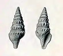 The white, slender shell has a fusiform shape It contains 9 -10 whorls. The whorls are angulated in the middle, concave in the upper portion and convex below. The whorls are bordered below the suture with a thickened margin. The longitudinal ribs are nodose. The plicae are delicate and oblique. The body whorl contains about 16 oblique ribs that become in the lower part attenuate and then almost obsolete. The white aperture measures about 3/7 the total length. The outer lip is tenuous and widely sinuate. The smooth columella is almost upright. The broad siphonal canal is oblique.[2]