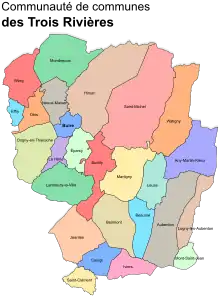 The Communauté de communes des Trois Rivières includes 26 communes:[2][4]