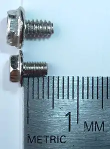The M3 is a metric screw specifying a nominal diameter of 3 millimetres (0.12 in); and standard coarse thread pitch defined as 0.5 millimetres (0.020 in). The M3 is the second most common screw found in PCs.[1] It commonly appears in many lengths from 1 to 20 mm. Nearly every brand-new computer case comes with a bag of these. Notwithstanding many exceptions, they are commonly used for securing the following devices:[2][3]
