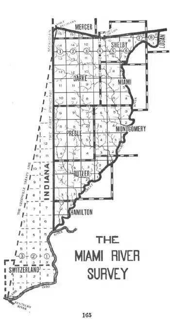 The survey in Ohio in modern times includes all or parts of nine counties: Butler, Darke, Hamilton, Logan, Mercer, Miami, Montgomery, Preble, and Shelby