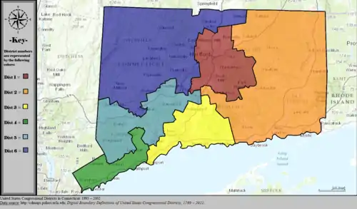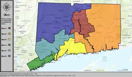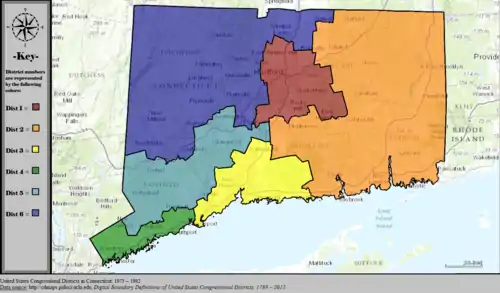 Table of United States congressional district boundary maps in the State of Connecticut, presented chronologically.[4] All redistricting events that took place in Connecticut between 1973 and 2013 are shown.