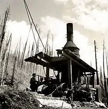 Soon after the first burn, a lawyer and businessman named William Charles Slattery with interests in the timber industry, came to Portland and organized The Consolidated Timber Company.[9] Henry F. Cheney, The Blodgett Company, Crossett-Western, and various other timber companies joined operations and built a large logging camp at the site.[1][10][11] Over $4 million was invested in the site and equipment. The railroad line was extended to the mill and beyond along the north side of Gales Creek. From here the track continued up to the summit to what was known as Owl Camp near present-day Rogers Camp. The line split here and continued north and south to various logging sites. Around 1936 the government provided federal aid as part of Roosevelt's "New Deal" for the construction of the Wilson River Highway in the hopes it would assist with firefighting and logging operations.