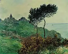 In August 1939, Miró moved his family to Varengeville-sur-Mer on the coast of Normandy, where he rented a cottage "Le Clos des Sansonnets" on the Route de l'Eglise. Miró had previously visited Varengeville where his friend, architect Paul Nelson owned a cottage.[5]: 57 p. Georges Braque, an old friend and now his neighbor, had built a house in Varengeville nearly a decade before and spent several months there each year.[11]: 62 p. Jacques Lassaigne stated Varengeville was "once a rallying point of the Surrealists", where Ardré Breton had conceived his seminal surrealist noval Nadja.[4]: 82 p. Jean-Baptiste-Camille Corot, Claude Monet, Pierre-Auguste Renoir, and Camille Pissarro had also painted the scenic region decades before. Wassily Kandinsky visited Miró and Braque in late 1939.[2]: 334 p. Despite conflicts elsewhere, the pastoral environment was conducive to work. Miró often produced work in series, and in Varengeville, he first painted a group of oil paintings on burlap on the theme of The Flight of a Bird over the Plain.[4]: 82 p. [5]: 57 p. The first of the Constellations, Sunrise was completed, signed, and dated January 21, 1940.