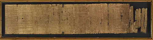 The Aristotelian text is unique because it is not a part of the Corpus Aristotelicum as preserved through medieval manuscripts. It was lost until two leaves of a papyrus codex carrying part of the text were discovered in the Fayum in 1879 and published in 1880.[1] A second, more extensive papyrus text was purchased in Egypt by an American missionary in 1890. E. A. Wallis Budge of the British Museum acquired it later that year, and the first edition of it by Frederic G. Kenyon was published in January, 1891.[2] The editions of the Greek text in widest use today are Kenyon's Oxford Classical Text of 1920 and the Teubner edition by Mortimer H. Chambers (1986, second edition 1994). The papyrus text is now held in the British Library.