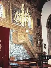 Paintings from the 18th century, framed in gilded-wood, flank each side of the altar: including to the right of the altar, the Menino entre os Doutores(Finding in the Temple), the Fuga para o Egipto (Flight into Egypt) and the Apresentação no Templo (Presentation of Jesus at the Temple); and to the left of the altar, the Visitação (Visitation), the Anunciação pelo Anjo (Annunciation) and the Casamento da Virgem (Marriage of the Virgin), located. The pulpit also in gilded wood, and its small staircase, is within the interior of the nave.