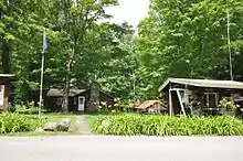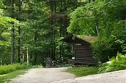 Near the park access road on VT 100A is a small parking and picnic area. The main access road climbs steeply to the contact station, from which a camping loop composed entirely of leantos branches off. This loop road roughly follows the contours of the hill, and the leantos are placed to provide views of the surrounding countryside. Continuing down the main access road, there is a second wooded camping loop for the use of tent campers and recreational vehicles; there are no sanitary or electrical connections here, but a dump station is located near the contact station. Beyond the tent loop is a larger picnic area with CCC-built pavilions.[1][3]