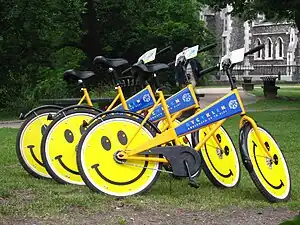 Copenhagen City Bikes or Bycykler København was the bicycle sharing system of Copenhagen, Denmark. Launched in 1995 with 1,000 cycles, the project was the world's first organized large-scale urban bike-sharing scheme,[1][2] which, unlike its Dutch predecessor, featured what are now considered basic elements such as coin deposit, fixed stands and specially designed bikes with parts that cannot be used on other bikes.[3] Riders paid a refundable deposit at one of 110 special bike stands and had unlimited use of a bike within the specified downtown area.[4] The scheme was funded by commercial sponsors. In return, the bikes carried advertisements, which appeared on the bike frame and the solid-disk type wheels. When the programme was abolished in October 2012, some 1,500–1,700 bikes were still in service, out of a total of 2,500 put onto the streets.[5]