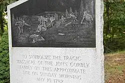 The Corbly family lived one mile north of Garards Fort, in southwest Pennsylvania at the John Corbley Farm.[1] The massacre occurred on Sunday morning, May 10, 1782, as the Corbly family traveled on foot to their place of worship. The Corbly family had left their home and were on their way to worship at a place where Reverend John Corbly was to preach. When Corbly discovered that the Bible, which he thought was in Mrs. Corbly's care, had been left at home, he returned to get it and then followed his family, meditating upon the sermon he was to preach.