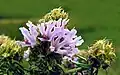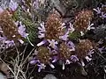 Coris monspeliensis, also known as Montpelier [sic] Coris,[1] a plant species in the primrose family, has erect or ascending stems which are woody at the base and densely covered with foliage. The leathery linear leaves, which grow up to 20 mm long are alternate and stalkless. They may be hairless or hairy and the highest leaves often have small teeth. The flowers with 5 unequal petals, each deeply lobed are borne in short dense clusters and vary in color from pink to blue. Each flower measures up to 12 mm across and has narrow, widely spread petals. The calyx is bell shaped and has up to 20 red or black spiny teeth. The spherical capsule is up to 2 mm in diameter.[2]