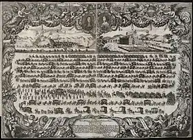Meyssens collaborated on the publication Historia di Leopoldo Cesare written by Galeazzo Gualdo Priorato and published in Vienna by the Flemish publisher from Antwerp Johann Baptist Hacque. The first and second volumes of the book were published in 1670 and a third one in 1674. The first volume described the political and military successes of Emperor Leopold I between 1656 and 1670. It was mainly illustrated with prints made by Flemish and Dutch printmakers after designs by other Netherlandish artists as well as artists from Germany and Italy. The illustrations mainly depict portraits of European monarchs and important aristocrats, castle scenes, battle scenes, maps and ceremonies. Apart from Meyssens, the Dutch and Flemish artists contributing were Frans Geffels, Jan de Herdt, Franciscus van der Steen, Gerard Bouttats, Adriaen van Bloemen, Sebastian van Dryweghen and Jacob Toorenvliet. German artists Moritz Lang, Johann Martin Lerch and Johann Holst and Italians Il Bianchi, Marco Boschini and Leonardus Hen.t Venetiis also contributed. Meyssens engraved a number of the portraits that were included in this work.[7]