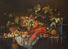 De Bryer painted fruit still lifes, vanitas still lifes and pronkstillevens, i.e. sumptuous still lifes of luxurious objects.[2][5] His dated works are 10 still lifes, which bear dates between 1651 and 1658.[6] He signed Bryer or Brier.[7]