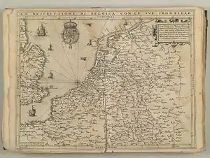 On 4 May 1567, a few days after Margaretha settled herself and her court in Antwerp for a few months in order to restore calm in this town, De Hooghe sold his "Hollandia-map" to the famous Antwerp printer Plantin. In 1567 his "Belgica-map appeared in the first edition of Ludovico Guicciardini's "Descrittione di tutti i Paesi Bassi". It is often assumed that this map was especially made for this book, but the differences in size show that De Hooghe just sold a slightly modified and signed reprint of these maps to the author. It is safer to assume that only the second version of this map was made for Guicciardini. The first unsigned version of this map must be dated prior to 1567, most probably rather close to the year 1559 of the peace of Cateau-Cambrésis and was made solely for use at the court. None of the existing first version maps that survived bears any sign of book binding, nor were they cut off in order to fit in Guicciardini's book. At the end of 1567 Margareth left for Italy after being replaced by the Duke of Alva. By this event, Cornelis lost his job as a court engraver and left for London. He is being mentioned on the 1567 Archbishop Grindal's list of religious refugees "Catalogus corum qui ex ditione Philippi Hispaniarum Regis Ecclesiae Belgico-Germanicae Londinensi subsunt".