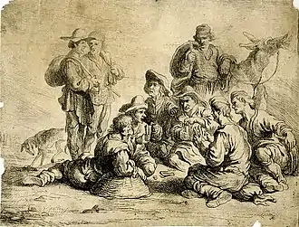 He also left many drawings some of which are in the collections of the Louvre and the British Museum. The British Museum holds an album of 53 drawings dating from 1640-1650 which covers mainly military subjects.[17] These drawings are generally direct and are often signed or inscribed.[9] Many of his religiously themed drawings were turned into prints by his nephew Jan Baptist de Wael.[18] The Antwerp engraver Melchior Hamers frequently engraved after the designs of de Wael. The Antwerp engraver and publisher Alexander Voet the Elder published engravings made after designs by de Wael such as the series of the Four Seasons and the Five Senses.[2] De Wael also engraved his own prints. The British Museum holds a series of 19 prints depicting genre scenes published by Martinus van den Enden the Elder in Antwerp.[19]