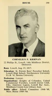 Kiernan served on the Lowell School Committee from 1948 to 1949. He then served as a member of the Massachusetts House of Representatives from 1949 to 1974. From 1958 to 1962 he was the House Majority Leader. He resigned as a Majority Leader to challenge incumbent John F. Thompson for the position of Speaker.[3] During the Speaker's election, Governor-elect Endicott Peabody took the unprecedented step of endorsing Michael Paul Feeney, a fellow liberal Democrat, over Thompson.[4] After Feeney failed to defeat Thompson on the first ballot, most of Feeney's supporters backed Kiernan as a compromise candidate. On the sixth and final ballot he lost to Thompson 118 votes to 78, with 28 votes going to Republican leader Sidney Curtiss and 24 members not voting. Kiernan's support was divided almost equally between anti-Thompson Democrats and Republicans, with 44 Democrats and 34 Republicans voting for him on the final ballot.[5]