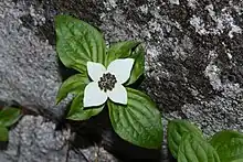 The taxonomy of this plant is not entirely certain.[11] This particular plant is not always considered a species in its own right. It is sometimes called a hybrid, or Cornus × unalaschkensis.[12] Sometimes it is listed as the same species as Cornus canadensis.[10] However, many authors consider it to be an allopolyploid, with chromosomes descended from C. canadensis and C. suecica.[2][8] The three species can be told apart by careful examination of the petal and leaf morphology.[2] Also, C. unalaschensis does not usually grow in the same regions as the other two plants.[2]